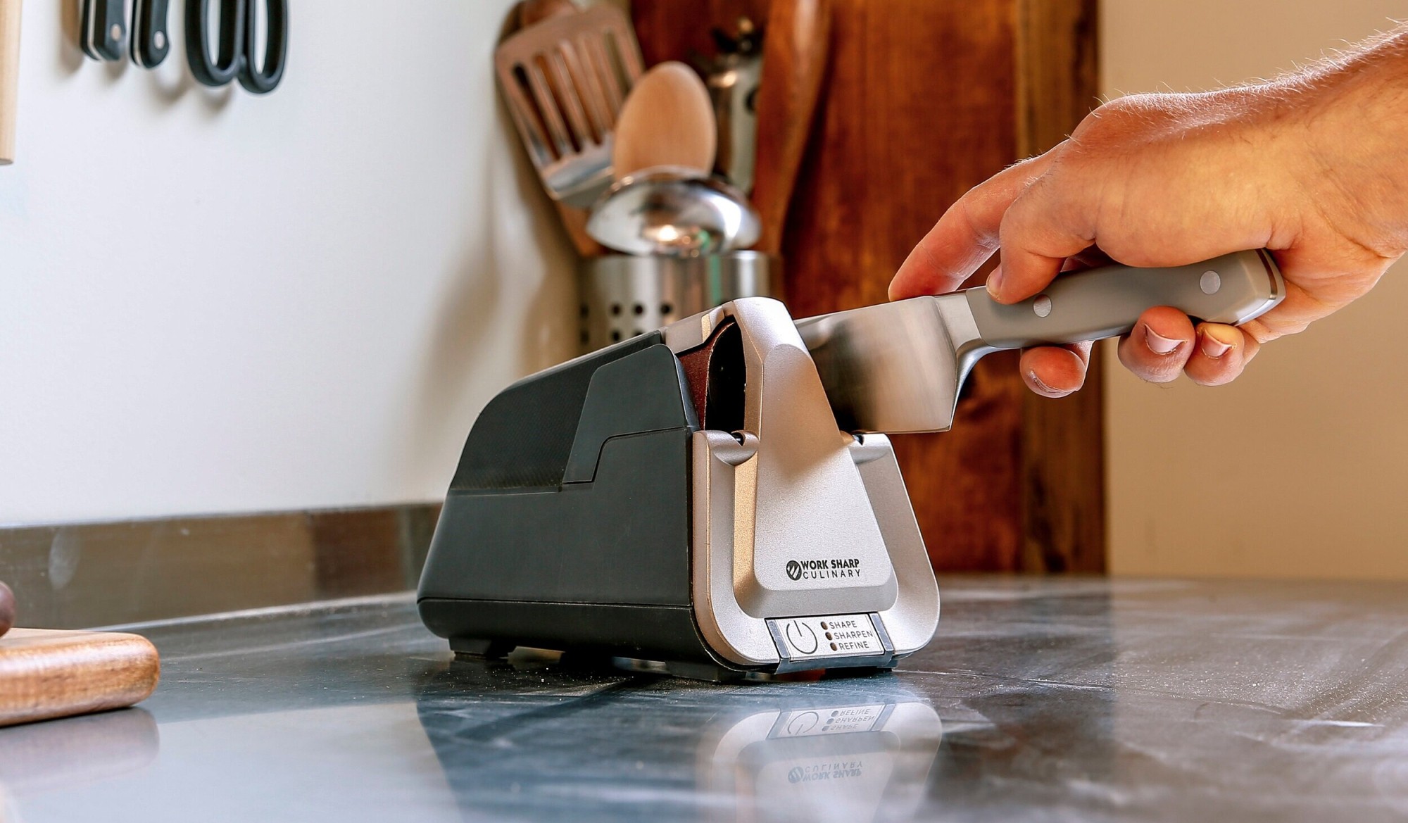 - Электрические точилки. Современный вариант решения проблемы с долгой заточкой домашних инструментов. Изделие приводится в действие одним нажатием кнопки и не требует знаний в работе с ножами. Линейка моделей Work Sharp Culinary включает специализированные устройства для профессиональной и домашней кухни. Они осуществляют несколько этапов заточки за счет регулирования скорости вращения абразива – от предварительного снятия слоя стали до финишной доводки и полировки. Такое устройство можно рекомендовать для работы с прямым и серрейторным лезвием вне зависимости от длины и толщины клинка.