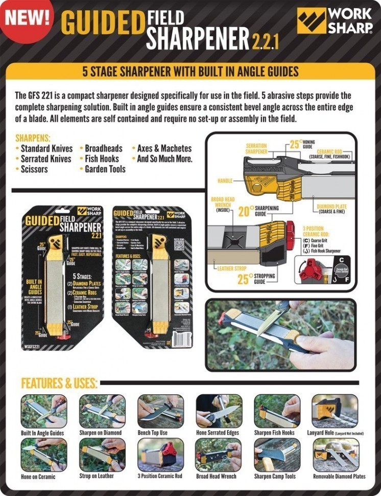 Данная точилка подойдёт для всех, кто любит часто бывать на природе и иметь в арсенале острые ножи и инструменты. Но Guided Field может использоваться и в качестве домашней, ведь она действительно многофункциональная. Точилка данной модели может заточить ножи, топоры, лопаты, ножницы, крючки, охотничьи наконечники и прочие инструменты.