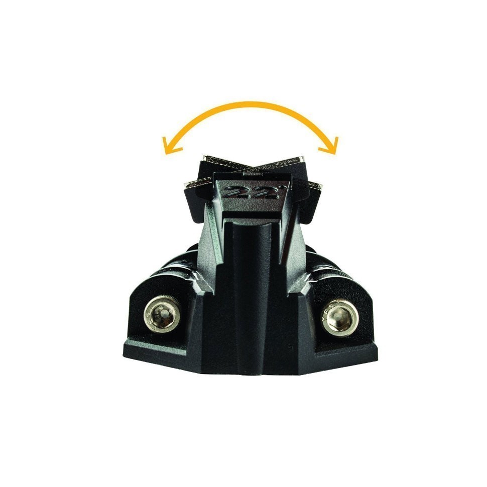 Точильная поверхность устанавливается на специальную платформу, которая крепится непосредственно к основанию. Благодаря подвижным металлическим стержням, основание устойчиво держится на любой ровной поверхности даже без дополнительных присосок. Платформу с точильными камнями можно установить в двух положениях в зависимости от того, какой нож вам необходимо заточить. Съемные направляющие угла предполагают заточку для кухонных ножей под углом 17° и прочих, в том числе и туристических, под углом 20°. Алмазных камня в наборе — два. Для более грубой заточки используется камень с зернистостью 320 грит, а для возобновления остроты того, который лишь немного затупился — 600 грит. Оба камня легко устанавливаются на платформе. Сама платформа — подвижная. Эта особенность позволяет выдержать установленный угол заточки на протяжении всей длины лезвия.