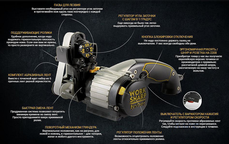 Также нужно учитывать, что точилка имеет усовершенствованную конструкцию с мощным двигателем и широким диапазоном регулирования угла заточки, наличием нескольких этапов заточки с разными скоростями, большим количеством совместимых абразивных лент разной зернистости, а также расширенным функционалом, благодаря насадке Work Sharp Ken Onion Edition. Все перечисленное гарантирует лезвию высокую остроту, которая стоит на одном уровне с заводской заточкой.